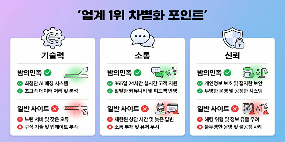 수많은 유흥 정보 사이트 중에서 유독 밤의민족이 독보적인 1위를 차지하는 이유는 명확합니다. 바로 다른 곳에서는 찾아볼 수 없는 강력한 3가지 차별점 덕분입니다.