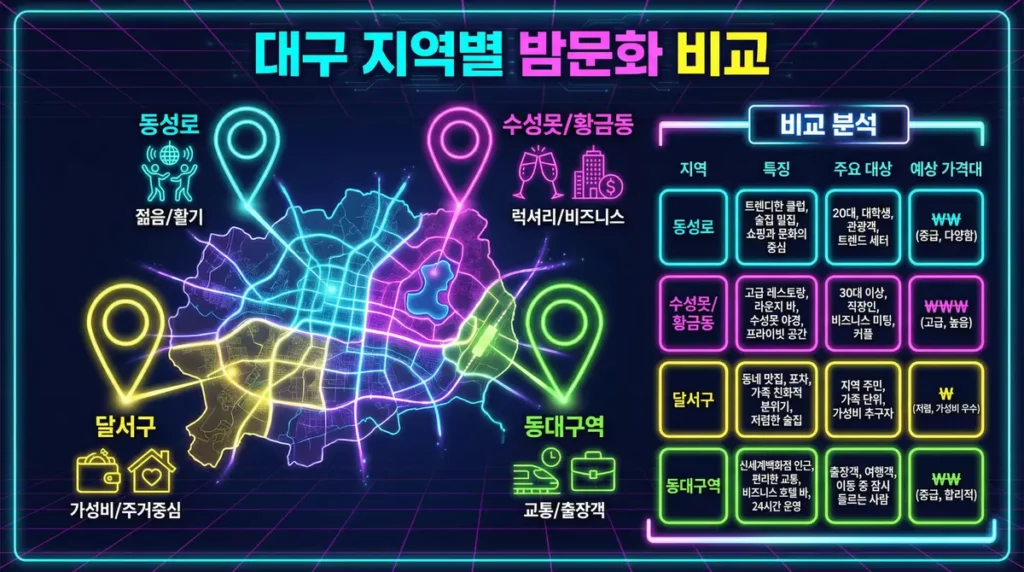 한눈에 보는 대구 주요 지역별 밤문화 특징 비교 (2026년
